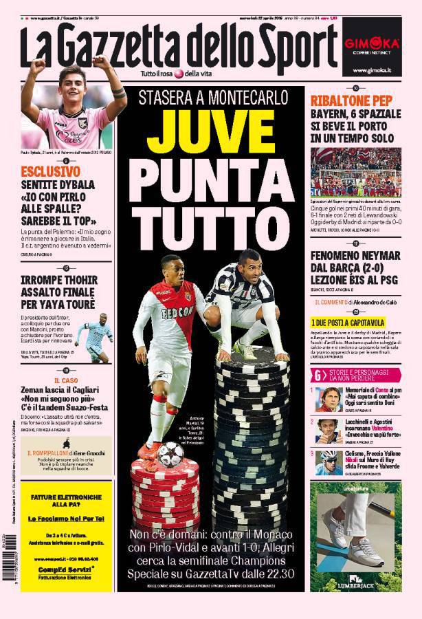 La Gazzetta dello Sport parla della Juventus che si giocherà l’accesso alle semifinali contro il Monaco nel match in programma questa sera.