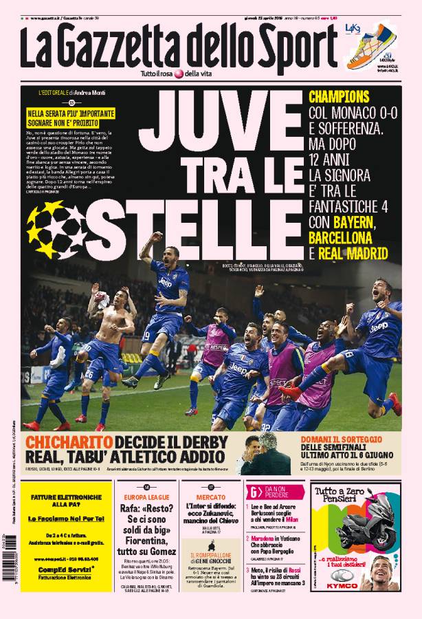 La Gazzetta dello Sport parla della Juventus che con lo zero a zero di Monaco passa alle semifinali di Champions League.