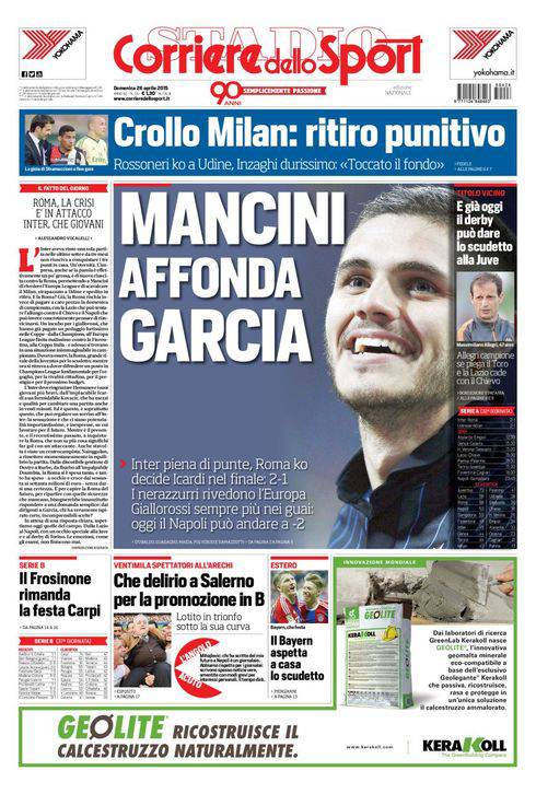 Corriere dello Sport: Mancini affonda Garcia. Inter piena di punte, Roma ko. Decide Icardi nel finale. I nerazzurri rivedono l’Europa. Giallorossi sempre più nei guai: oggi il Napoli può andare a -2. Crollo Milan: ritiro punitivo.