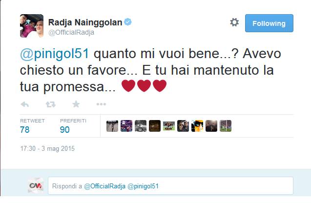 Dopo il pareggio della Lazio contro l’Atalanta, Radja Nainggolan ringrazia l’ex compagno di squadra ai tempi del Cagliari, Mauricio Pinilla, oggi in forza ai nerazzurri di Bergamo. “Quanto mi vuoi bene? Avevo chiesto un favore… e tu hai mantenuto la tua promessa”, scrive il belga su Twitter riferendosi alla grande prestazione della squadra di Reja contro i biancocelesti.