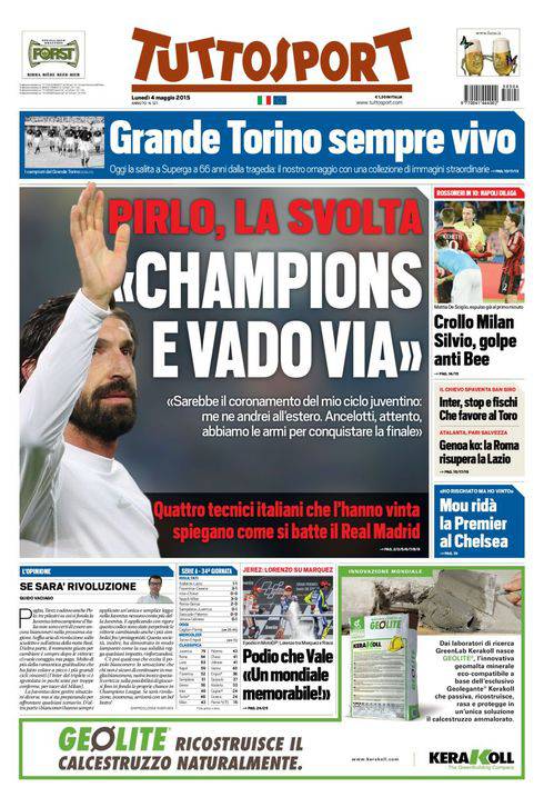 Tuttosport riporta le parole di Pirlo che in caso di vittoria della Champions lascerebbe la Juventus per volare all’estero.