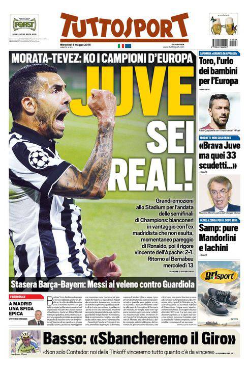 Tuttosport – Juve sei Real 06/05/2015 di Ruggieri Tuttosport ha parlato della Juventus che vince due a uno contro il Real Madrid. Ora sotto con il ritorno al Bernabeu. Samuele Roccati