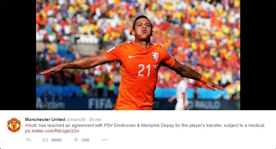 Il Manchester United ha chiuso con il Psv per Depay. L’annuncio ufficiale arriva dal profilo Twitter dei Red Devils che afferma: “Il Manchester United ha raggiunto un accordo con il PSV Eindhoven e Memphis Depay per il trasferimento del giocatore, soggetto alle visite mediche”. Primo colpo quindi per Van Gaal in vista della prossima stagione, con l’allenatore che avrà quindi a disposizione uno dei suoi pupilli, convocato anche per gli ultimi mondiali disputati dall’Olanda in Brasile. Non sono ancora note le cifre relative al trasferimento.