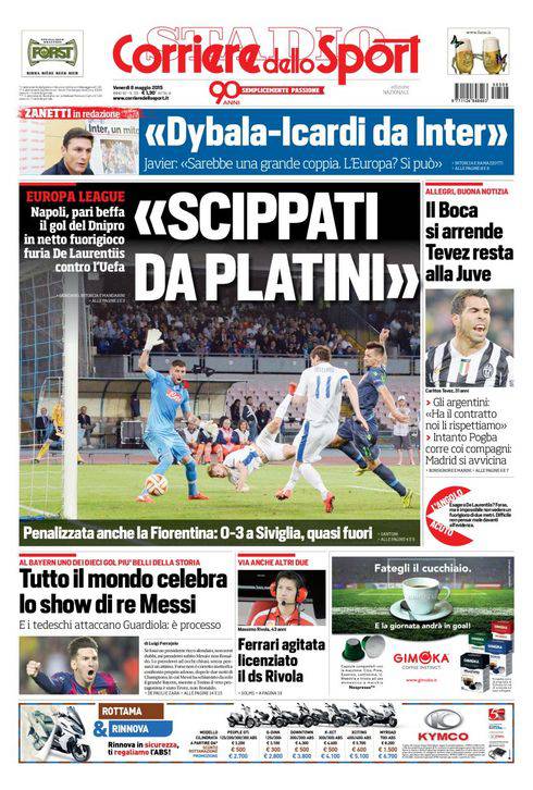 Il Corriere dello Sport parla della furia di De Laurentiis che si scaglia contro Platini dopo l’uno a uno contro il Dnipro con il gol degli ucraini in evidente fuorigioco.