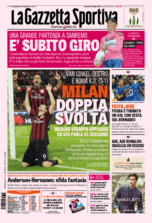 Milan, doppia svolta. Inzaghi strappa applausi, Silvio parla di cessione. Van Ginkel e Destro, Roma Ko (2-1). Prova d’orgoglio dei rossoneri, ma tiene banco Berlusconi: “Pronto a vendere anche la maggioranza se serve a tornare competitivi”.