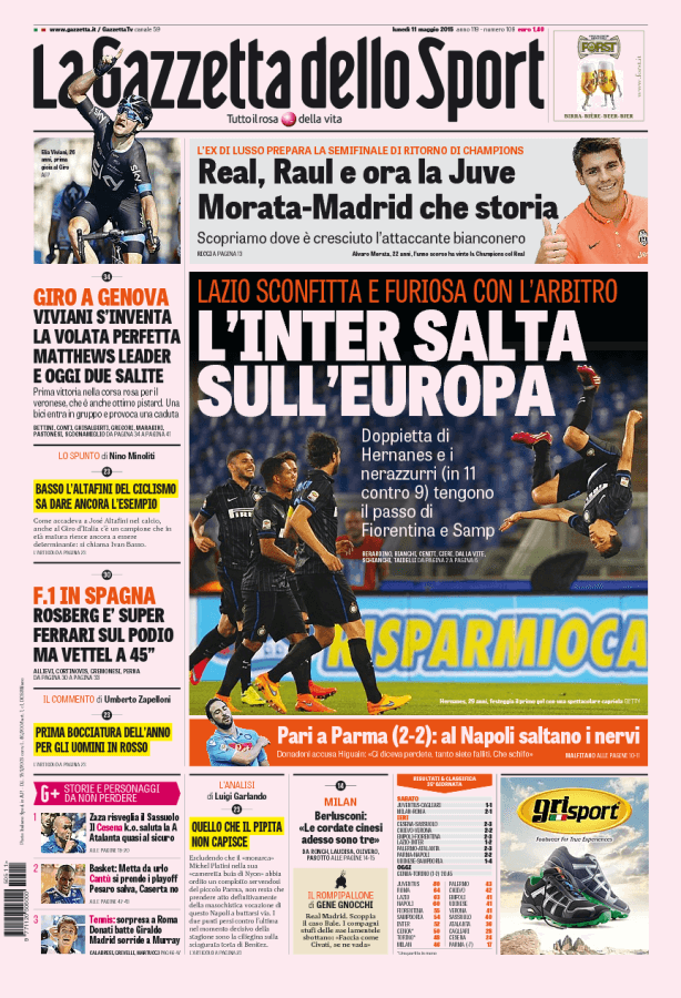 La Gazzetta dello Sport parla dell’Inter che vince contro la Lazio per due a uno giocando però in 11 contro 9.