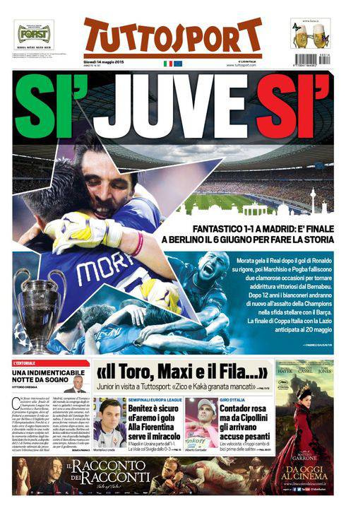 Tuttosport celebra la grande prestazione della Juventus a Madrid che porta i bianconeri a Berlino nella finale contro il Barcellona.