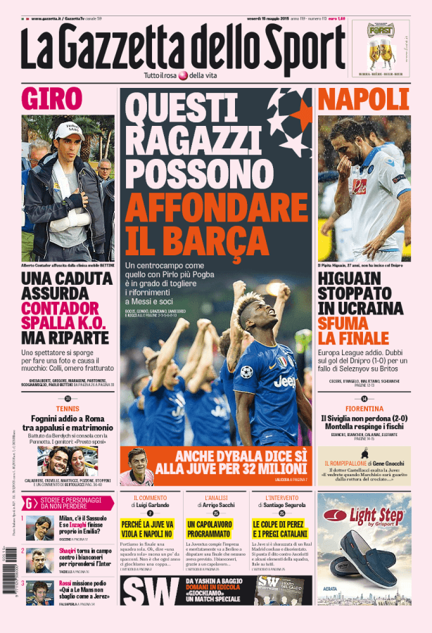 La Gazzetta dello Sport parla della Juventus che può battere il Barcellona nella finale di Champions League.