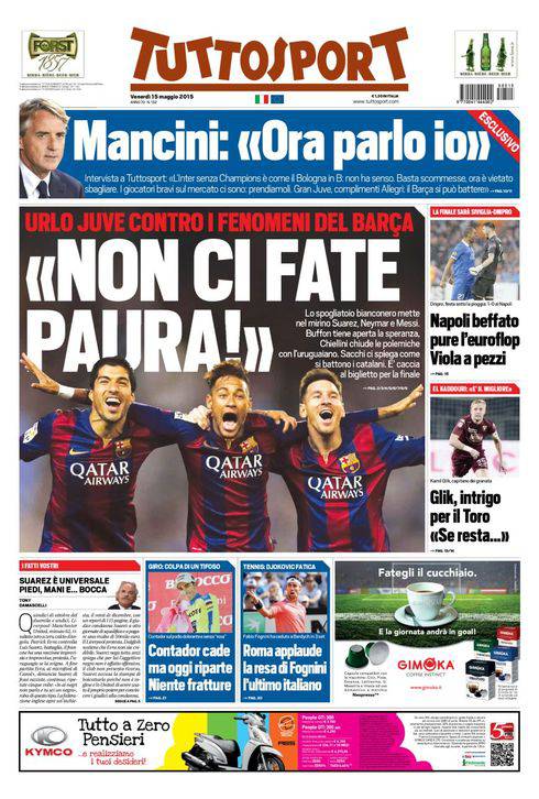 Tuttosport esorcizza il tridente del Barcellona Messi, Neymar, Suarez, i tre non fanno paura alla corazzata Juventus.