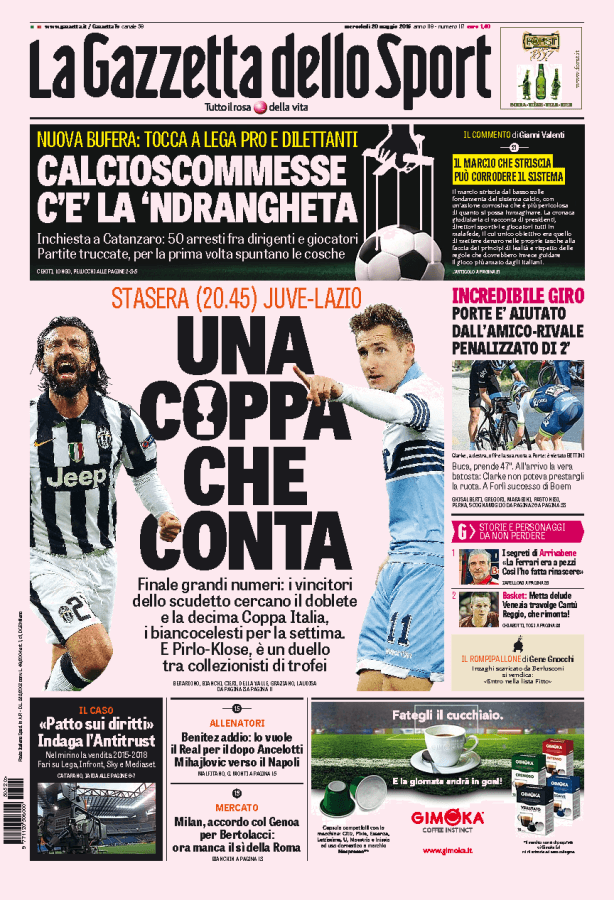La Gazzetta dello Sport parla della finale di Coppa Italia in programma questa sera tra la Juventus di Allegri e la Lazio di Pioli.