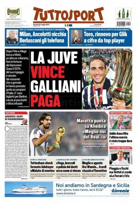 Tuttosport ironizza su Galliani che dopo aver lasciato Pirlo e Allegri, oggi protagonisti nella Juventus, ha anche prestato gratis ai bianconeri Matri con tanto di metà stipendio pagato.