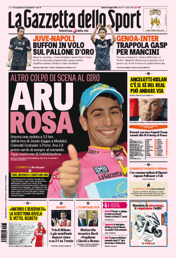 La Gazzetta dello Sport parla del Giro d’Italia con il corridore sardo Aru che conquista momentaneamente la maglia rosa.