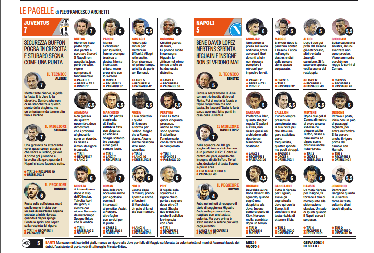 La Juventus non molla un colpo e, nell’ultima uscita allo Stadium, davanti al proprio pubblico, nel giorno dei festeggiamenti per la conquista dello scudetto e della Coppa Italia, batte il Napoli per 3-1. Grande prestazione di Gigi Buffon così come quella di Sturaro e Coman. Il migliore, nei voti della Gazzetta dello Sport è proprio Sturaro, autore di un gran gol. Nel Napoli, invece, si salvano in pochi, su tutti David Lopez ma la prestazione della squadra è da paura.