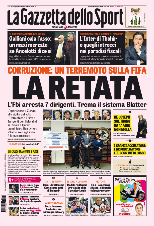 La Gazzetta dello Sport parla dello scandalo corruzione all’interno della Fifa che ha portato a più di sette arresti, trema Blatter.