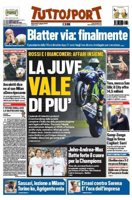 Tuttosport parla del connubio tra Juventus e Valentino Rossi, l’azienda del “Dottore” produrrà il merchandising della Juventus nella prossima stagione.