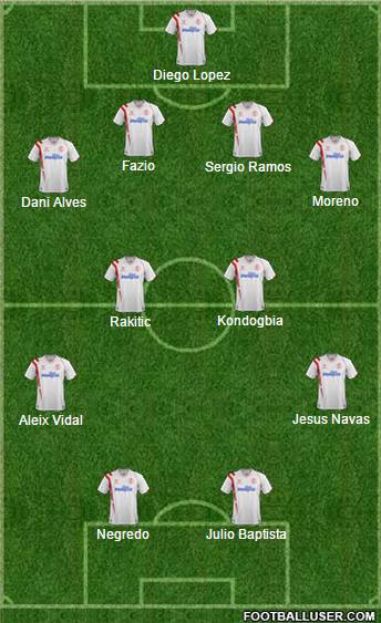Il Siviglia ha vinto ormai due settimane fa la sua seconda Europa League consecutiva ed il prossimo anno sarà di scena in Champions League per misurarsi nella massima manifestazione continentale. Il club andaluso tra l’altro negli ultimi anni ha ceduto diversi big riuscendo però a rimanere sempre competitivo. Dalle cessioni del Siviglia si può creare una squadra di altissimo livello che vede Diego Lopez in porta con una difesa a quattro formata da Moreno, Fazio, Sergio Ramos e Dani Alves. Centrocampo con Rakitic, autore di un gol nella finale di Champions League di quest’anno insieme a Kondogbia, oggetto del desiderio di Milan ed Inter. Sulle fasce spazio a Jesus Navas e Aleix Vidal, appena ceduto al Barcellona. Attacco formato da Julio Baptista e Negredo. La partenza che ha portato più soldi nelle casse della società spagnola è stata quella di Dani Alves che ha fruttato 35 milioni di euro.