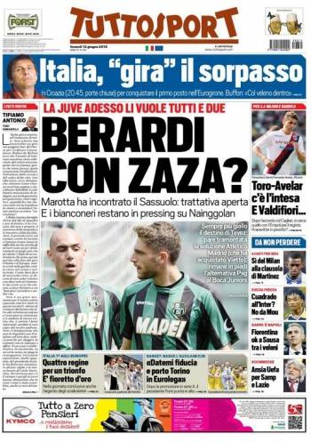 Su Tuttosport si parla di Berardi che potrebbe arrivare alla Juventus assieme al compagno di squadra Zaza.