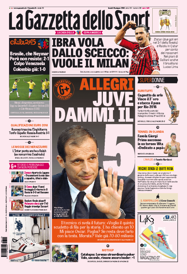 Massimiliano Allegri si racconta in un’esclusiva alla Gazzetta dello Sport rivelando di voler Oscar del Chelsea.