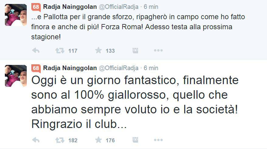 Futuro voluto dal giocatore, che su Twitter commenta, in due tweet: “Oggi è un giorno fantastico, finalmente sono al 100% giallorosso, quello che abbiamo sempre voluto io e la società! Ringrazio il club e Pallotta per il grande sforzo, ripagherò in campo come ho fatto finora e anche di più! Forza Roma! Adesso testa alla prossima stagione!”