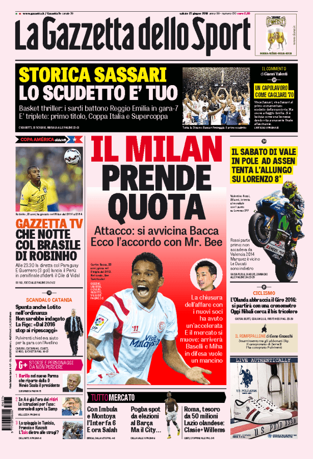 La Gazzetta dello Sport parla del Milan che è molto vicino a Bacca, attaccante colombiano del Siviglia che piace a Mihajlovic.