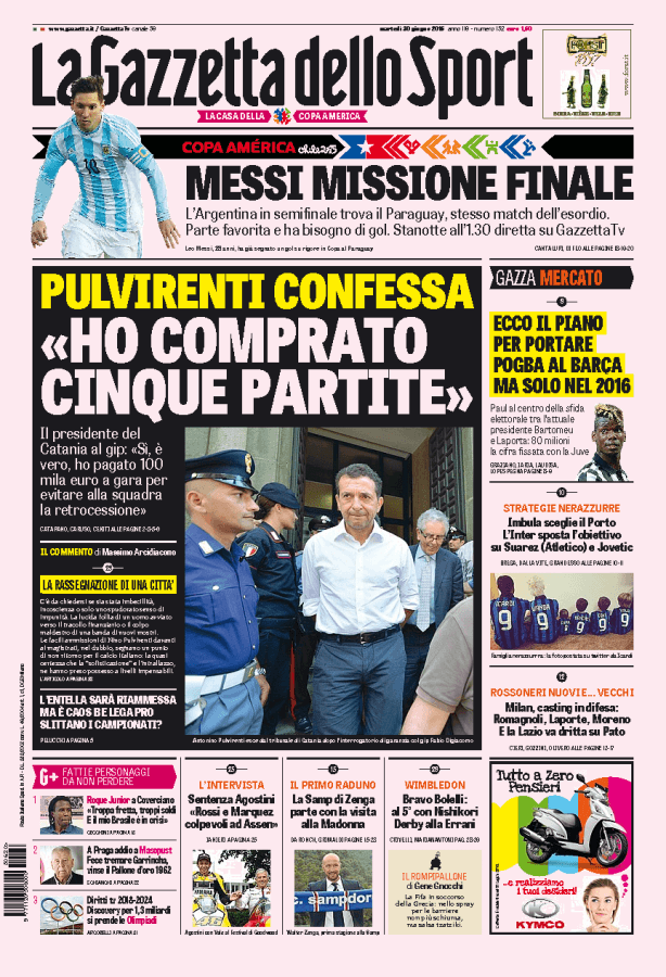 La Gazzetta dello Sport parla dello scandalo Catania con Pulvirenti che ha ammesso di aver comprato cinque partite.