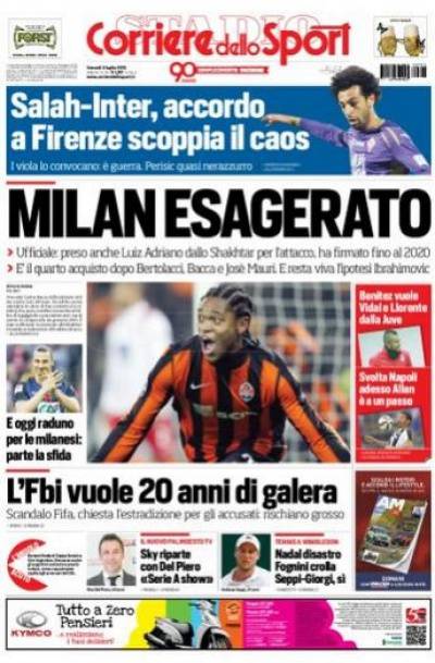 Il Corriere dello Sport parla di Luiz Adriano che è un nuovo giocatore del Milan. Altro bomber per i rossoneri.