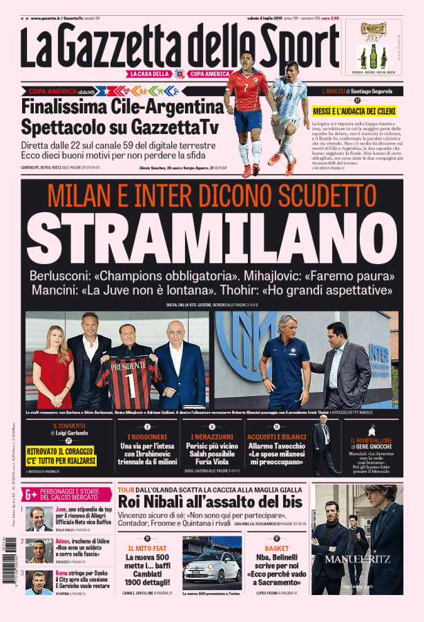 La Gazzetta dello Sport parla di Milan e Inter che ieri si sono radunate e sono pronte a sfidare la Juventus.