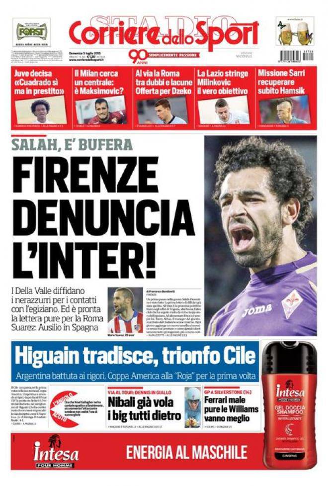 I Della Valle diffidano i nerazzurri per i contatti con l’egiziano. Ed è pronta la lettera pure per la Roma. Suarez: Ausilio in Spagna. Juve decisa: “Cuadrado sì ma in prestito”.Il Milan cerca un centrale: è Maksimovic? Al via la Roma tra dubbi e lacune. Offerta per Dzeko. La Lazio stringe. Milinkovic il vero obiettivo. Missione Sarri: recuperare subito Hamsik.