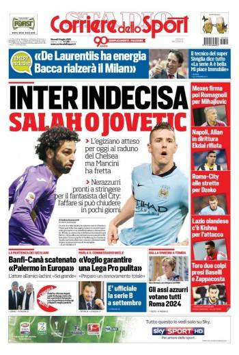 Il Corriere dello Sport parla dell’Inter che vorrebbe puntare su Salah o Jovetic in vista della prossima stagione.