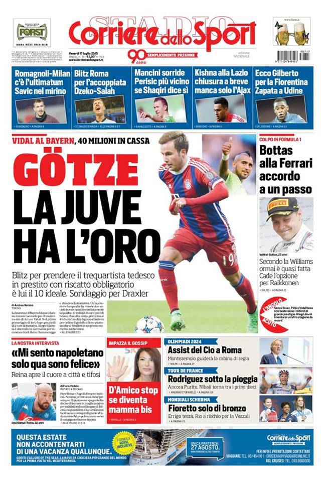 Vidal al Bayern Monaco per 40 milioni. Blitz per prendere il trequartista tedesco in prestito con riscatto obbligatorio. Sondaggio per Draxler. Romagnoli-Milan, c’è l’ultimatum. Savic nel mirino. Blitz Roma per l’accoppiata Dzeko-Salah. Mancini sorride: Perisic più vicino se Shaqiri dice sì. Kishna alla Lazio, chiusura a breve. Ecco Gilberto per la Fiorentina.