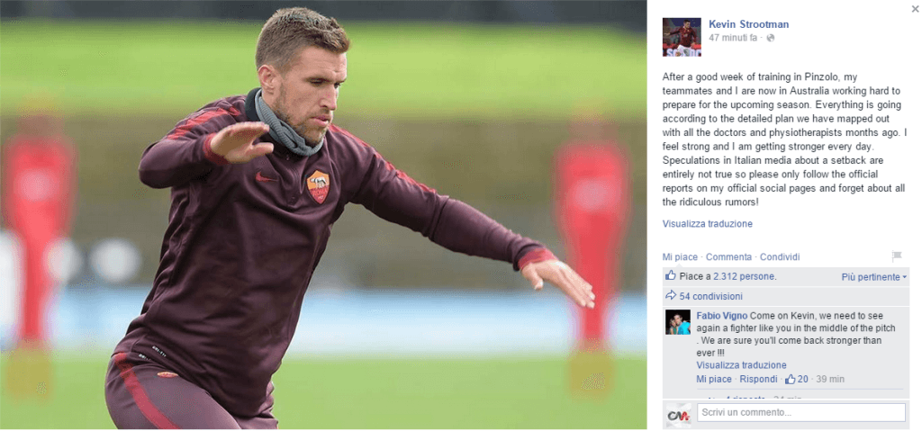 Kevin Strootman si affida al proprio profilo Facebook per smentire le voci circa rallentamenti per il suo recupero, definendole come ridicole. Ecco le parole del centrocampista olandese: ‘Dopo una buona settimana di allenamenti a Pinzolo, io e i miei compagni siamo adesso inAustralia lavorando per preparare la prossima stagione. Tutto sta andando secondo i piani dei dottori e dei fisioterapisti. Mi sento forte e sto diventando più forte ogni giorno. Le speculazioni dei media italiani circa un contrattempo sono completamente false e vi prego di seguire solo i comunicati della mia pagina ufficiale e dimenticarvi delle voci ridicole’.