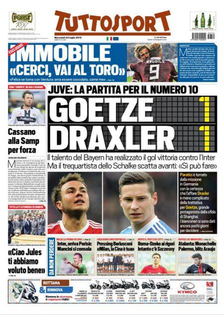 Tuttosport – Gotze-Draxler 1-1 22/07/2015 di Ruggieri Al momento è in pareggio la sfida tra Gotze e Draxler per la maglia numero 10 della Juventus. Chi la spunterà? Samuele Roccati