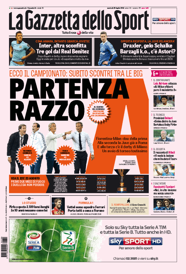 Gazzetta dello Sport – Partenza a razzo. Ecco il campionato, subito scontri fra le big. Fiorentina-Milan clou della prima. Alla seconda Juve già a Roma. Alla terza c’è il derby di Milano.