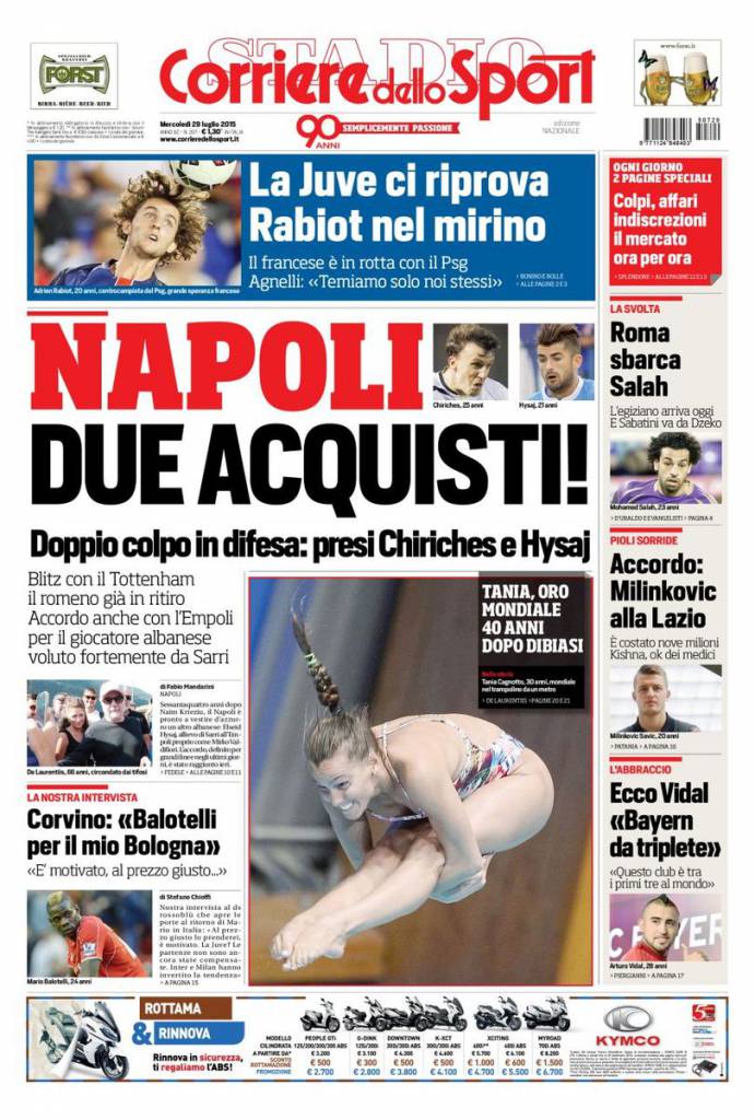 Il Corriere dello Sport parla del Napoli che ha praticamente preso Chiriches del Tottenham e Hysaj dell’Empoli.