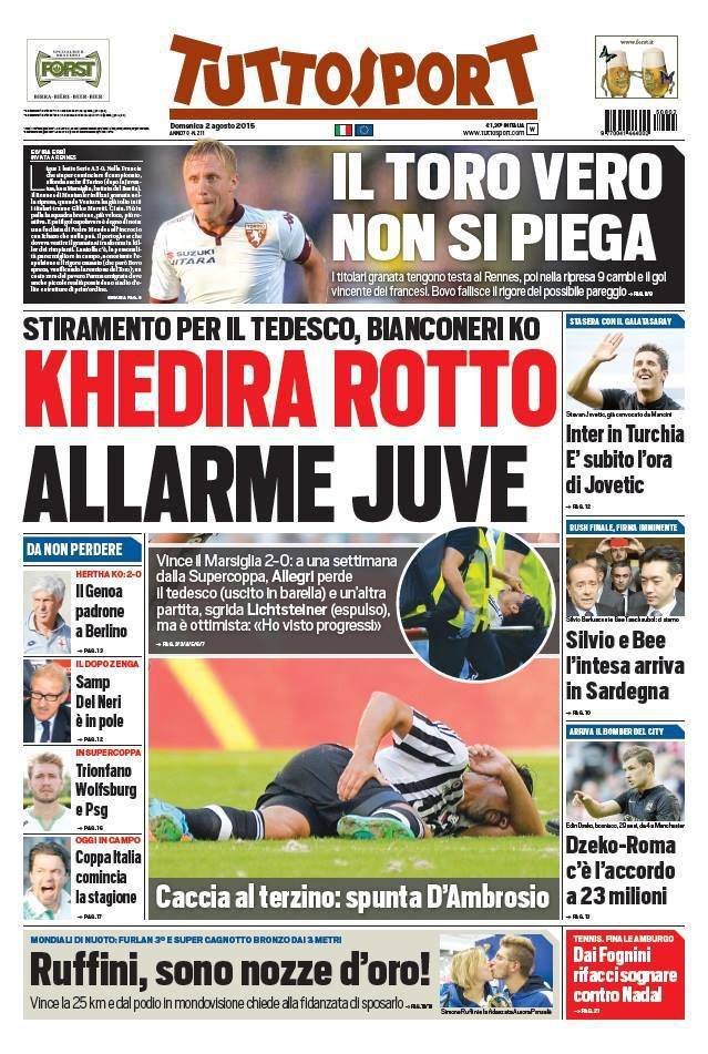 La Juventus cade contro il Marsiglia e perde Sami Khedira, uscito in barella. Dzeko-Roma: c’è l’accordo a 23 milioni. Silvio e Bee, l’intesa arriva in Sardegna.