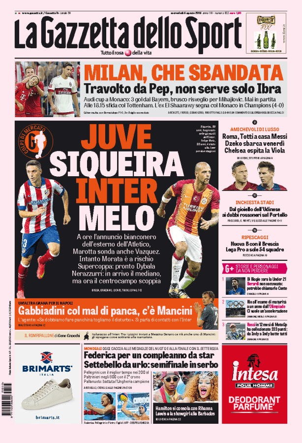 La Gazzetta dello Sport parla della Juventus vicina a Siqueira mentre l’Inter è ad un passo da Felipe Melo.