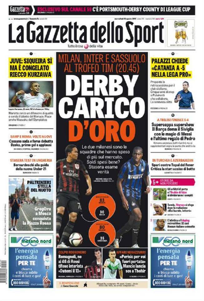 Rassegna Stampa: Gazzetta dello Sport – Derby carico d’oro 12/08/2015 di S. Dibenedetto Milan, Inter e Sassuolo si sfidano nel Trofeo Tim, in onda questa sera su canale 5. Juve, Siqueira sì ma è congelato. Riescco Kurzawa. Palazzi chiede: “Catania a -5 nella Lega Pro”. Stella Dibenedetto – www.calciomercatonews.com