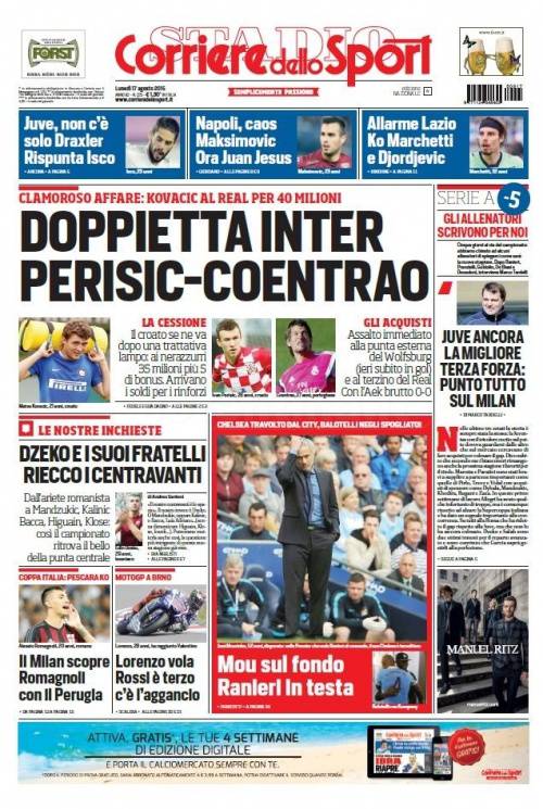 Il Corriere dello Sport parla del doppio colpo Inter in vista della prossima stagione con Perisic e Coentrao nel mirino.
