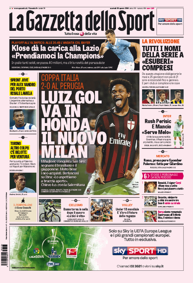 La Gazzetta dello Sport parla del Milan che vince due a zero contro il Perugia in Coppa Italia. In gol Luiz Adriano e Honda.