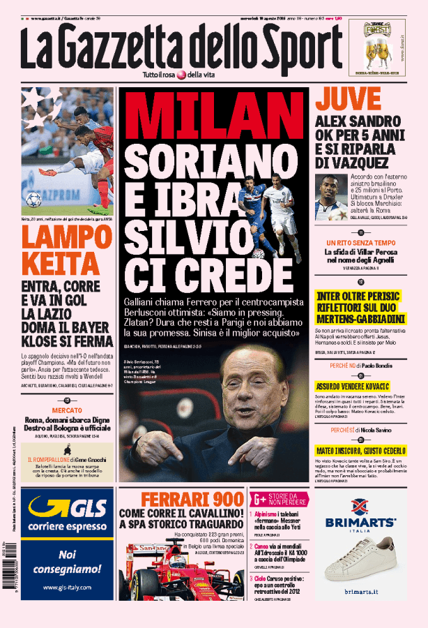 La Gazzetta dello Sport parla del doppio colpo Milan con il possibile arrivo di Soriano e Ibrahimovic alla corte di Mihajlovic.