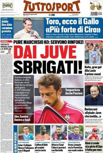 Anche Claudio Marchisio dovrà restare fermo 20 giorni per questo Tuttosport invita i bianconeri a puntare su qualche rinforzo.