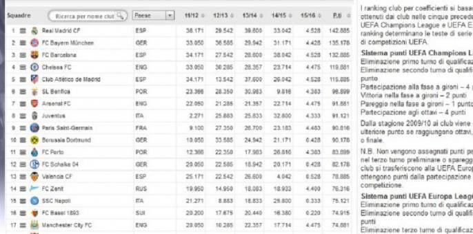 Dopo le gare preliminari di Europa League, la Uefa ha aggiornato il ranking per club. Al primo posto c’è sempre il Real Madrid, seguito da Bayern Monaco e Barcellona. La Juventus è la prima delle italiane all’ottavo posto. Nel ranking stagionale dopo Juve e Roma c’è la Sampdoria, mentre la Lazio è solo 210a nonostante la vittoria sul Bayer Leverkusen nei preliminari.