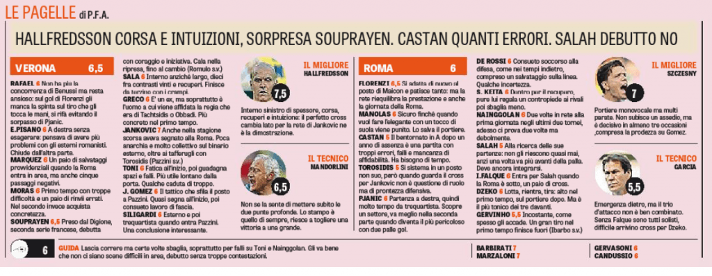 La Roma non brilla nel debutto del campionato contro l’Hellas Verona. Dei nuovi brilla solo il portiere polacco Szczesny che salva il risultato due volte, sullo 0-0, dopo un errore di Manolas. Bene Dzeko mentre deve entrare ancora nei meccanismi l’egiziano Salah. Reparto difensivo giallorosso da rivedere con Castan che, tornato dopo una lunga assenza, commette anche diversi errori. Nell’Hellas, invece, grande prova di Hallfredsson. Bene anche Sala e Jankovic.