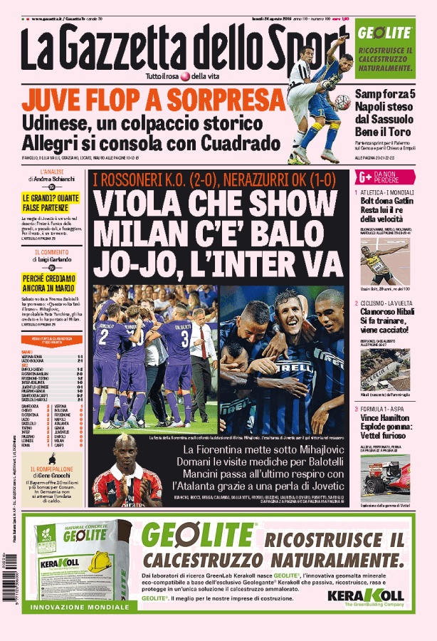 La Gazzetta dello Sport parla della vittoria della Fiorentina sul Milan per due a zero. I rossoneri si consoleranno con Balotelli. Un lampo di Jovetic permette all’Inter di vincere contro l’Atalanta.