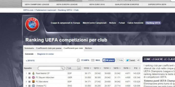 La Uefa ha aggiornato il Ranking per club. Al comando c’è sempre il Real Madrid mentre la prima delle italiane è la Juventus, all’ottavo posto. Più in basso le altre italiane: Napoli al sedicesimo posto, Milan al 21esimo e Inter al 26esimo.