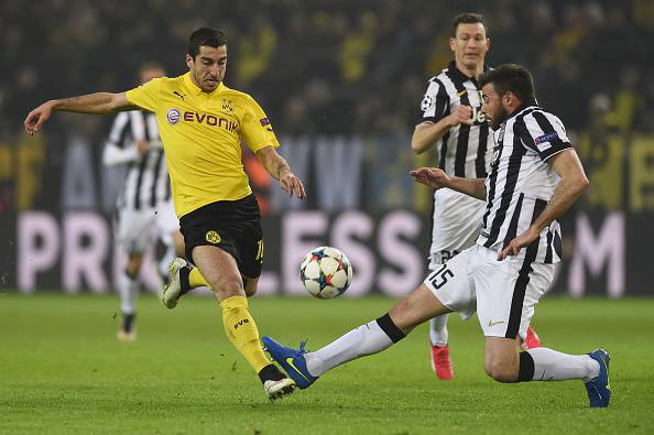 Dortmund's Armenian midfielder Henrikh Mkhitaryan (L) and Juventus' defender Andrea Barzagli vie for the ball during the Round of 16, second-leg UEFA Champions League football match Borussia Dortmund vs Juventus in Dortmund, western Germany on March 18, 2015.  AFP PHOTO / TOBIAS SCHWARZ        (Photo credit should read TOBIAS SCHWARZ/AFP/Getty Images)