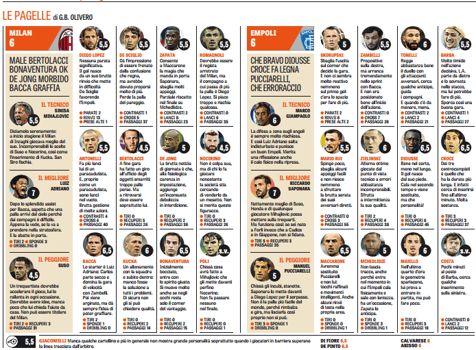 Nonostante la vittoria sull’Empoli, la Gazzetta dello Sport, così come Mihajlovic, boccia la prestazione del Milan. Voti bassissimi quelli che il quotidiano sportivo assegna all’intera squadra. A salvarsi, infatti, sono solo Luiz Adriano, il migliore, autore del gol della vittoria, e Bacca, protagonista di una magia in occasione del primo vantaggio. Promossi anche Kucka e Bertolacci. Male la difesa e bocciatura totale per Suso. Nel complesso, meglio l’Empoli dove si distingue l’ex Saponara, autore del momentaneo pareggio e di una grande prova.