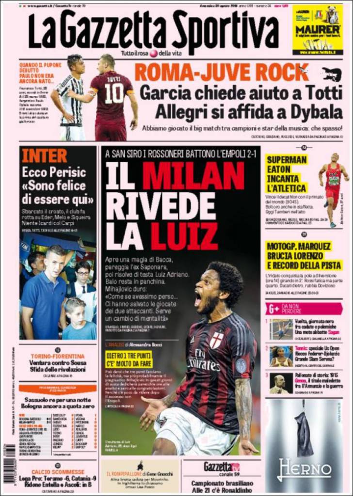 Apre una magia di Bacca, pareggia l’ex Saponara, poi risolve di testa Luiz Adriano. Balotelli resta in panchina. Mihajlovic duro: “Come se avessimo perso. Ci hanno salvato le giocate dei due attaccanti. Serve un cambio di mentalità”. Roma-Juve rock: Garcia chiede aiuto a Totti, Allegri si affida a Dybala.