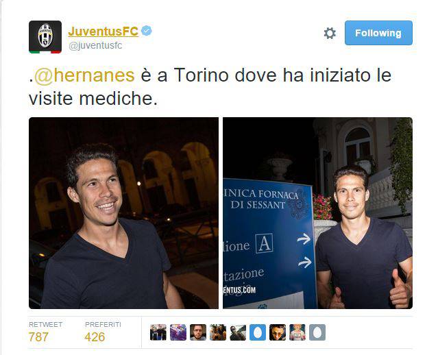 L’account Twitter ufficiale annuncia l’arrivo a Torino del nuovo calciatore della Juventus, il brasiliano Hernanes. Il calciatore ex Inter e Lazio arriva a titolo definitivo dietro il pagamento di 11 milioni di euro. Si attende adesso soltanto l’ufficialità.