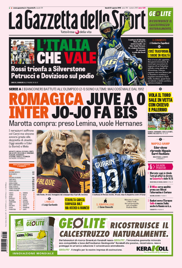 La Gazzetta dello Sport parla della Roma che batte due a uno la Juventus, i bianconeri dopo due giornate restano a zero. L’Inter vince due a uno contro il Carpi grazie alla doppietta di Jovetic.